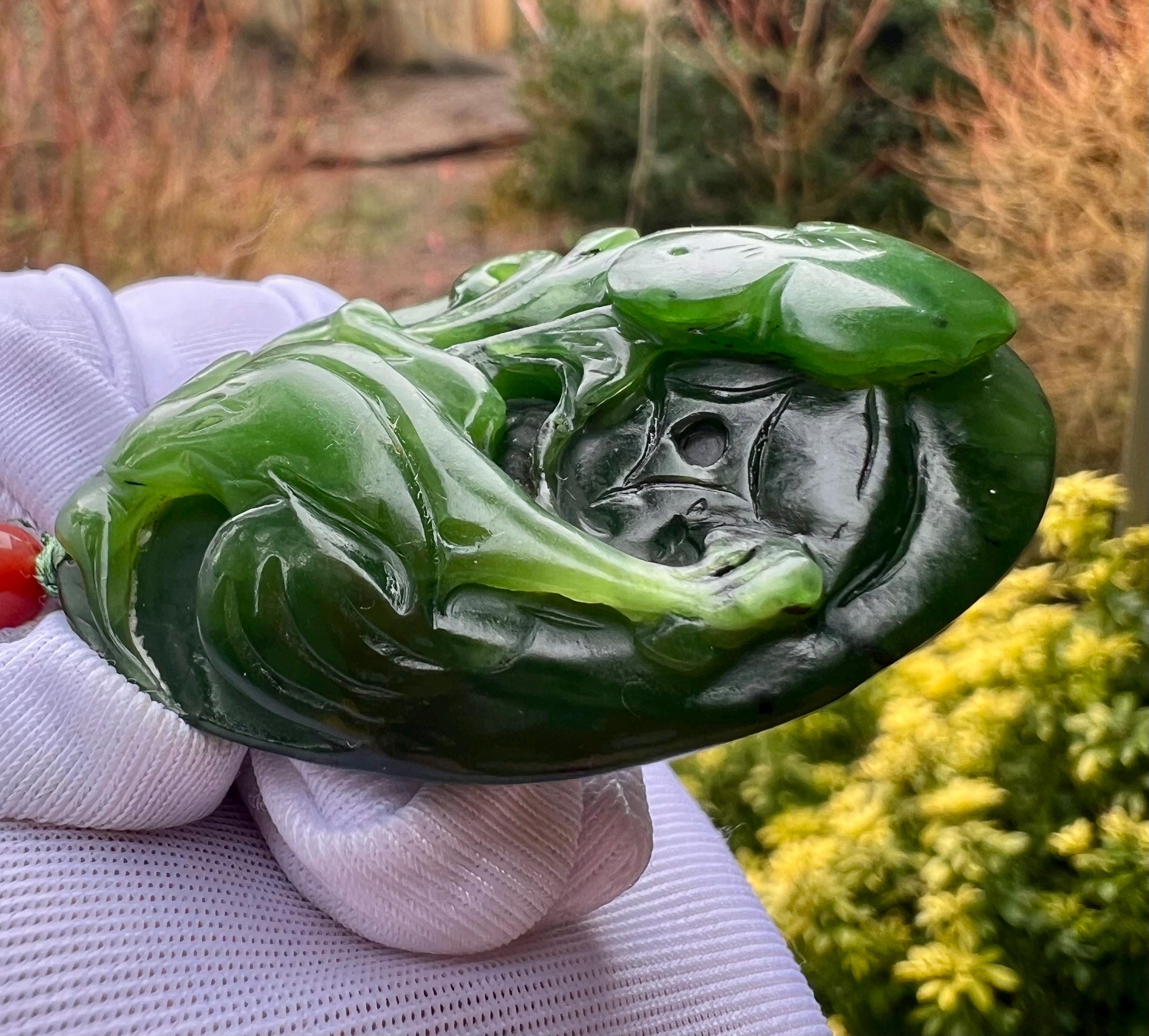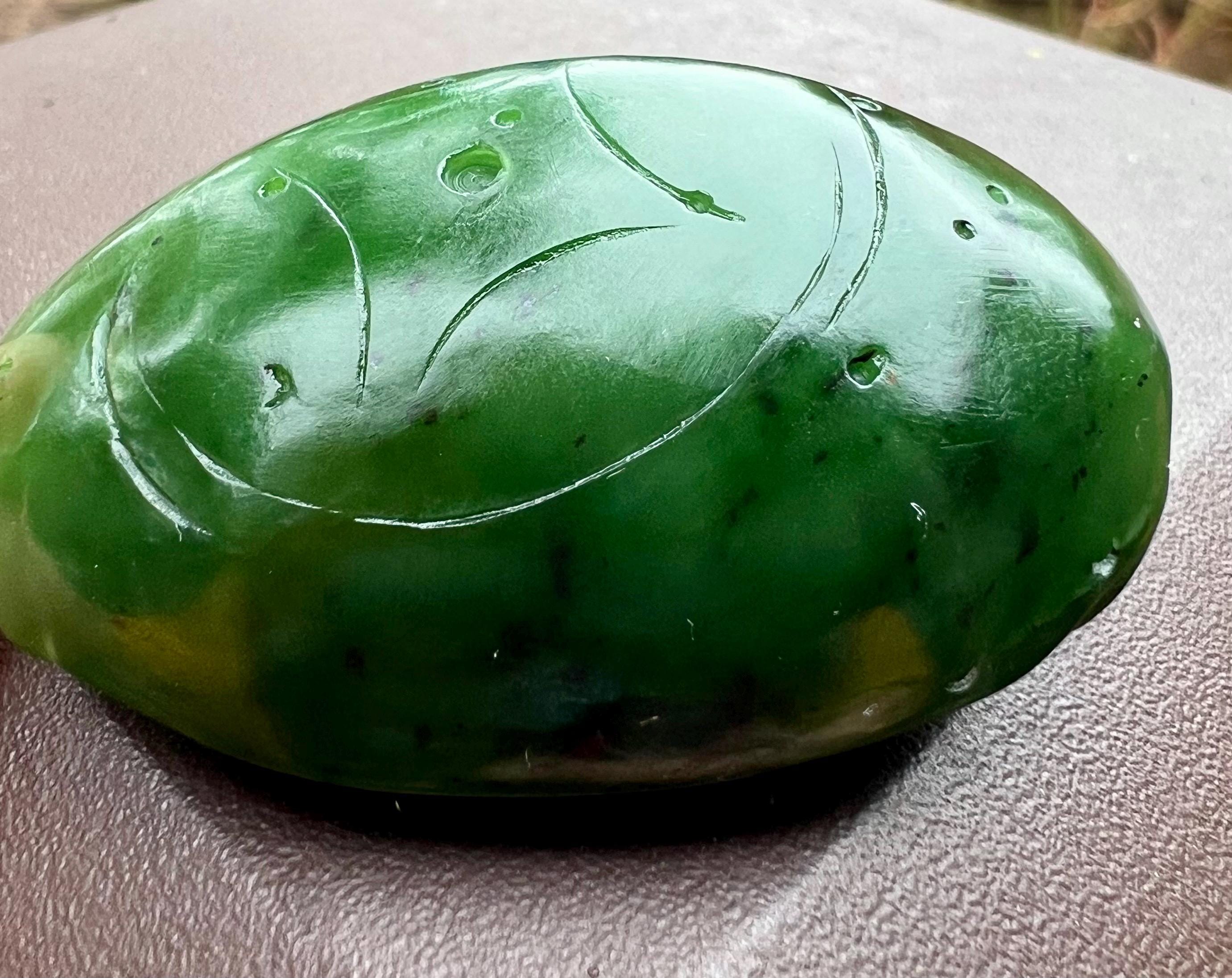 天然碧玉 雕刻凤凰和灵芝如意,玉质油润,颜色饱满。手工雕刻。