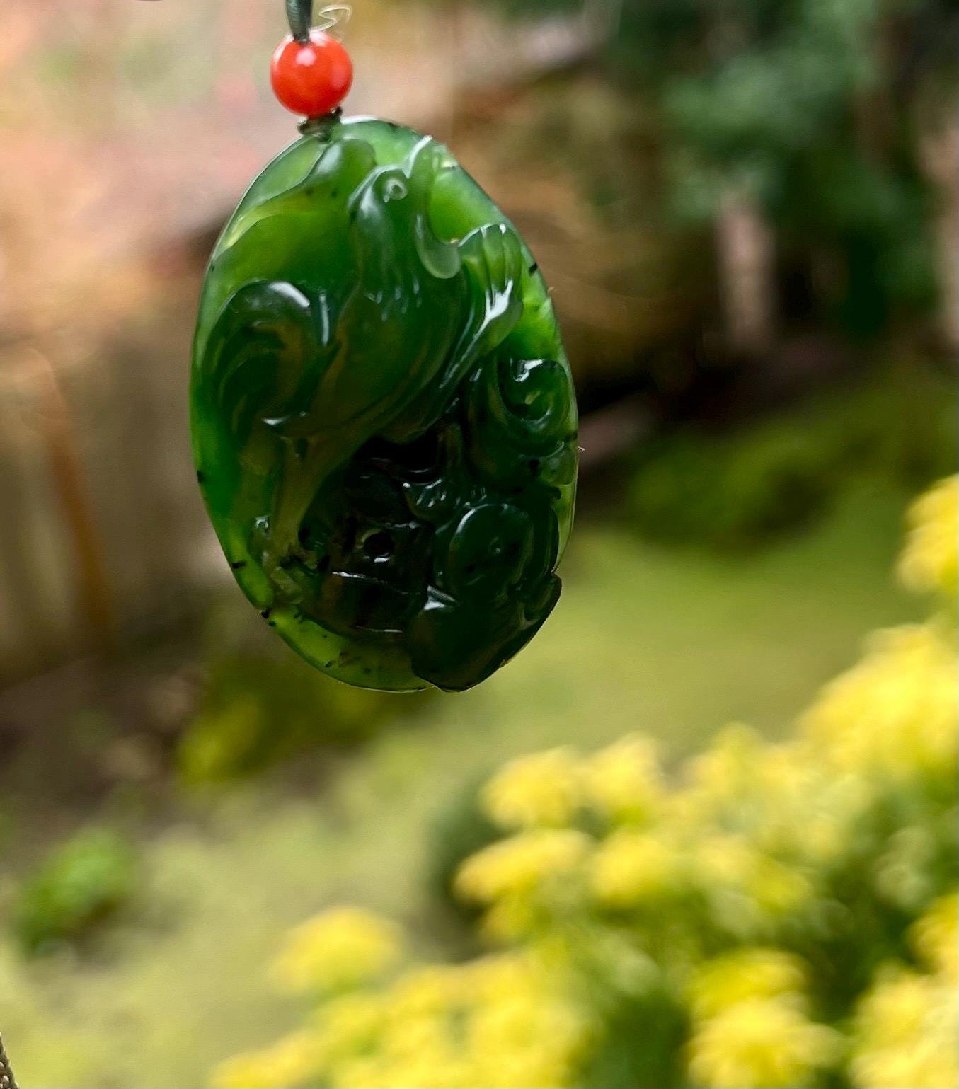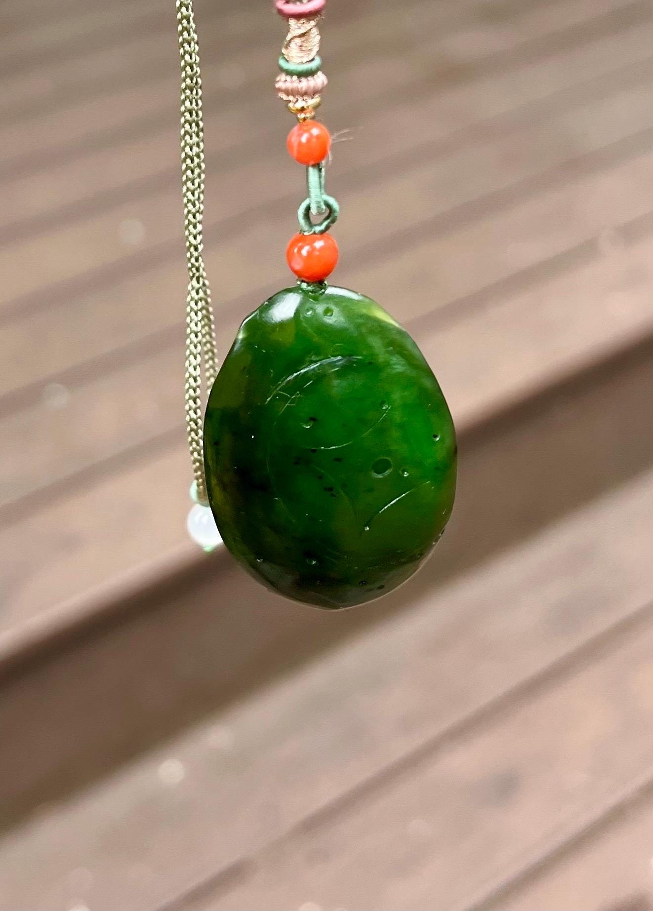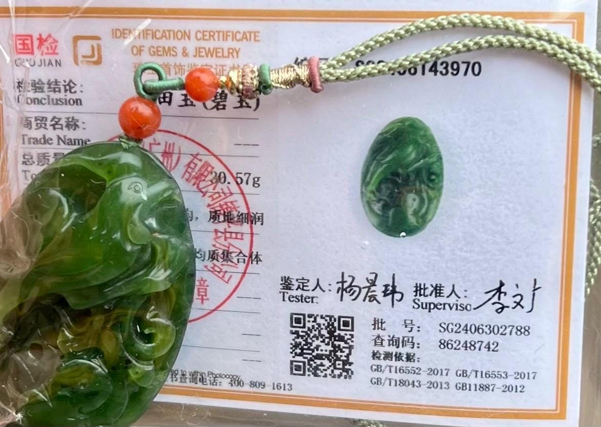 Certified natural nephrite green jade/ green nephrite carved Phoenix and Ruyi pendant necklace 天然碧玉 雕刻凤凰来仪吊坠 手工绳项链 #3970
