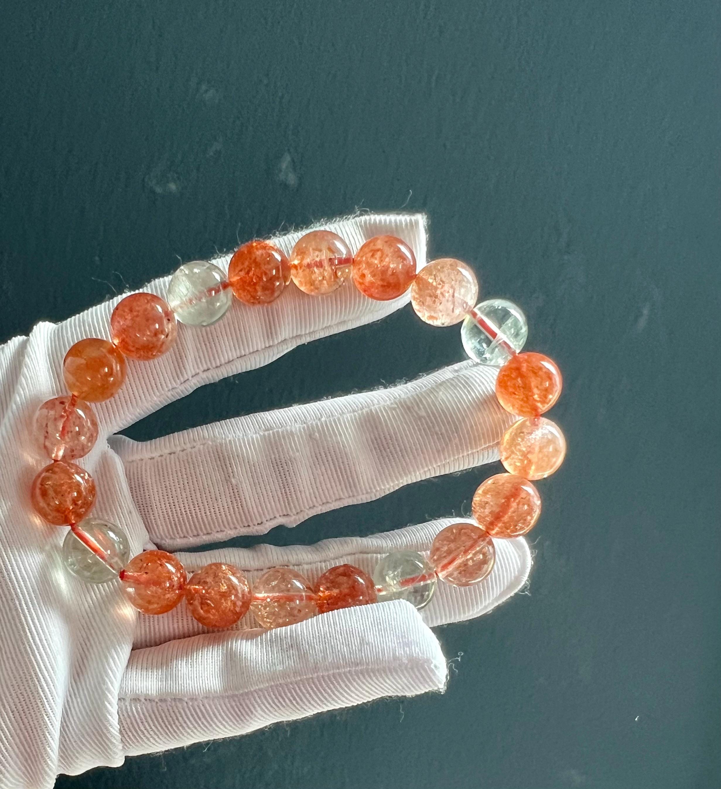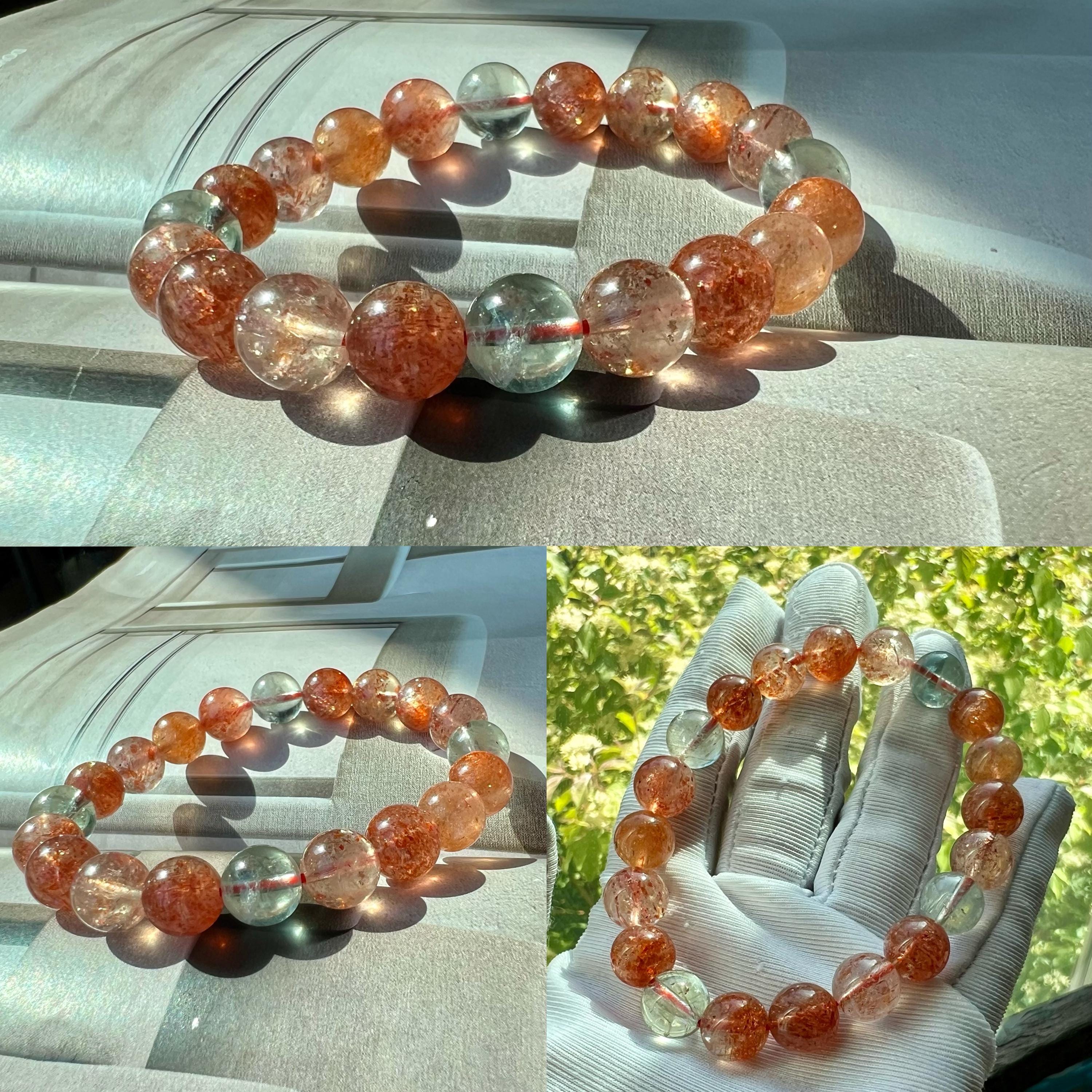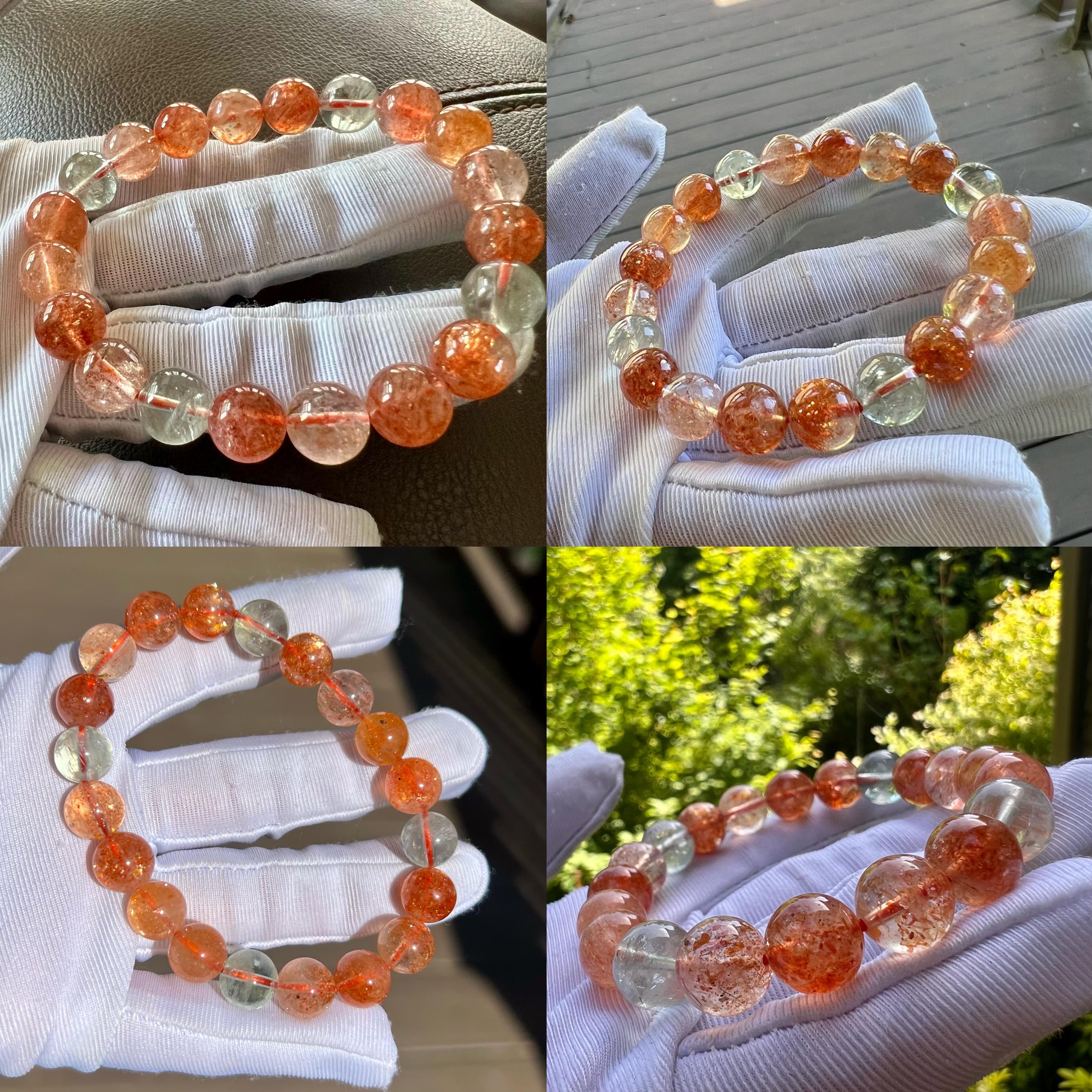 9.5mm Certified natural high quality Arusha bracelet, golden sunstone and light green Beryl/powerful crystal 天然阿鲁沙金太阳石金草莓绿柱石共生手串 #5502