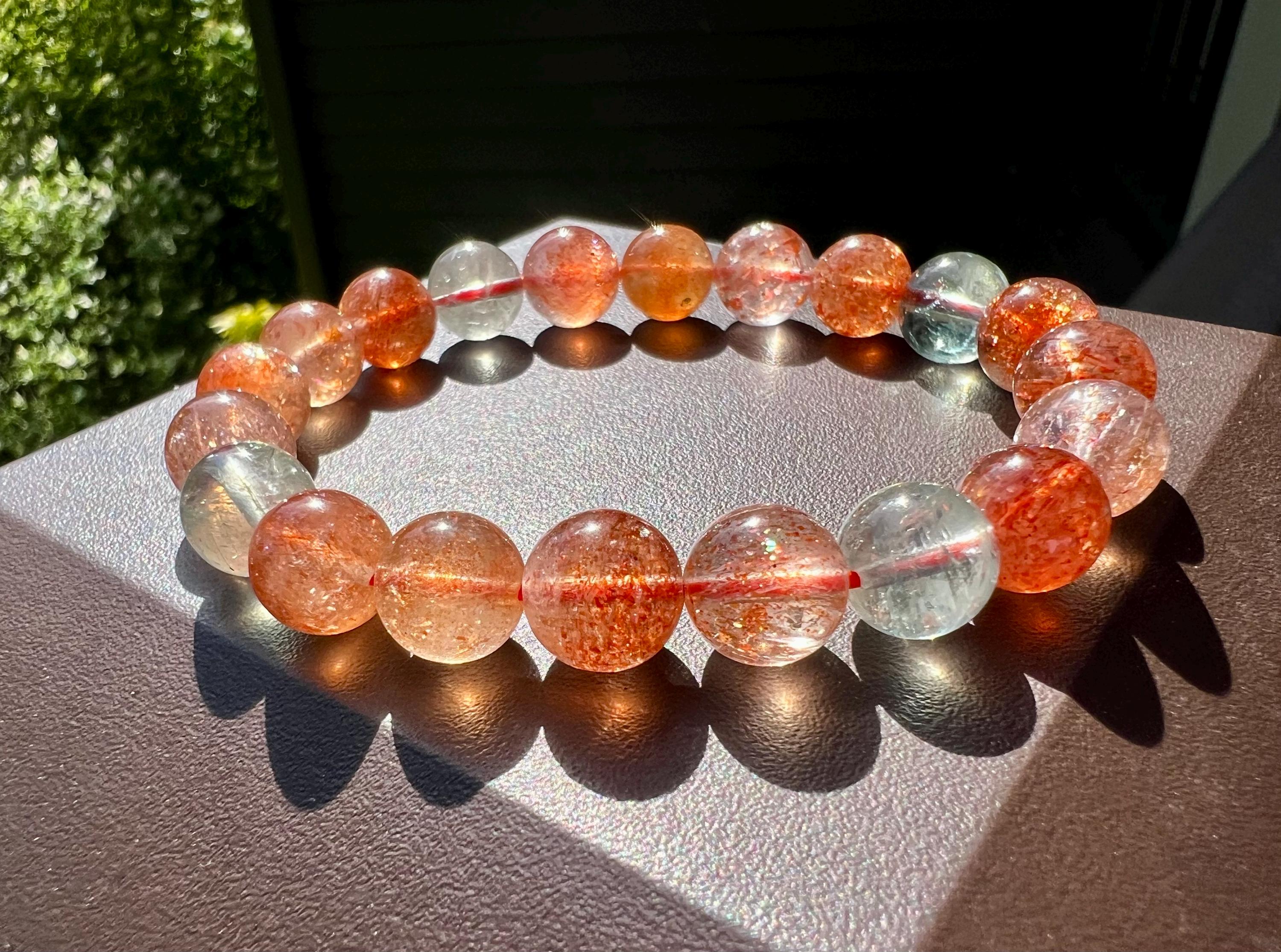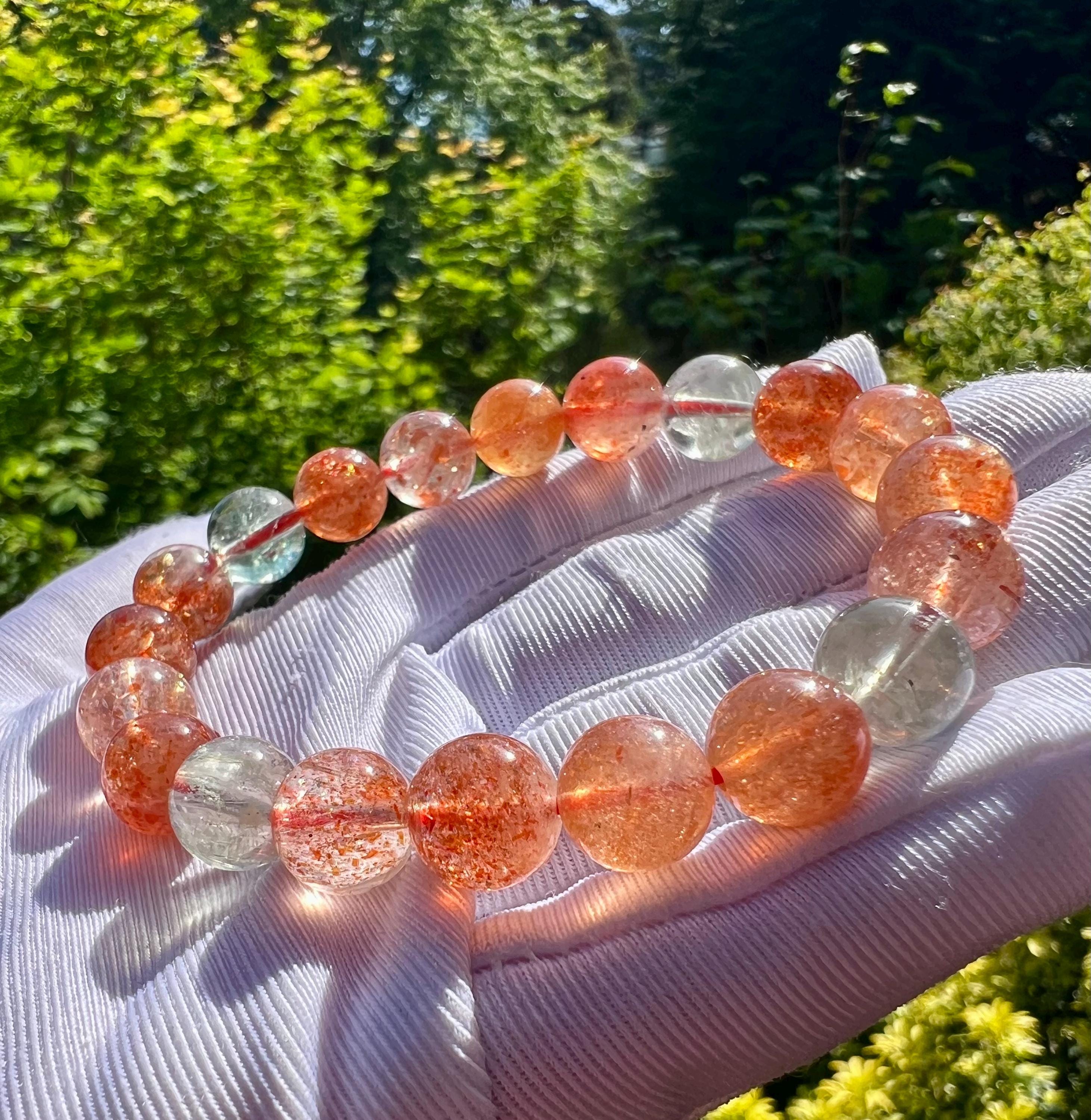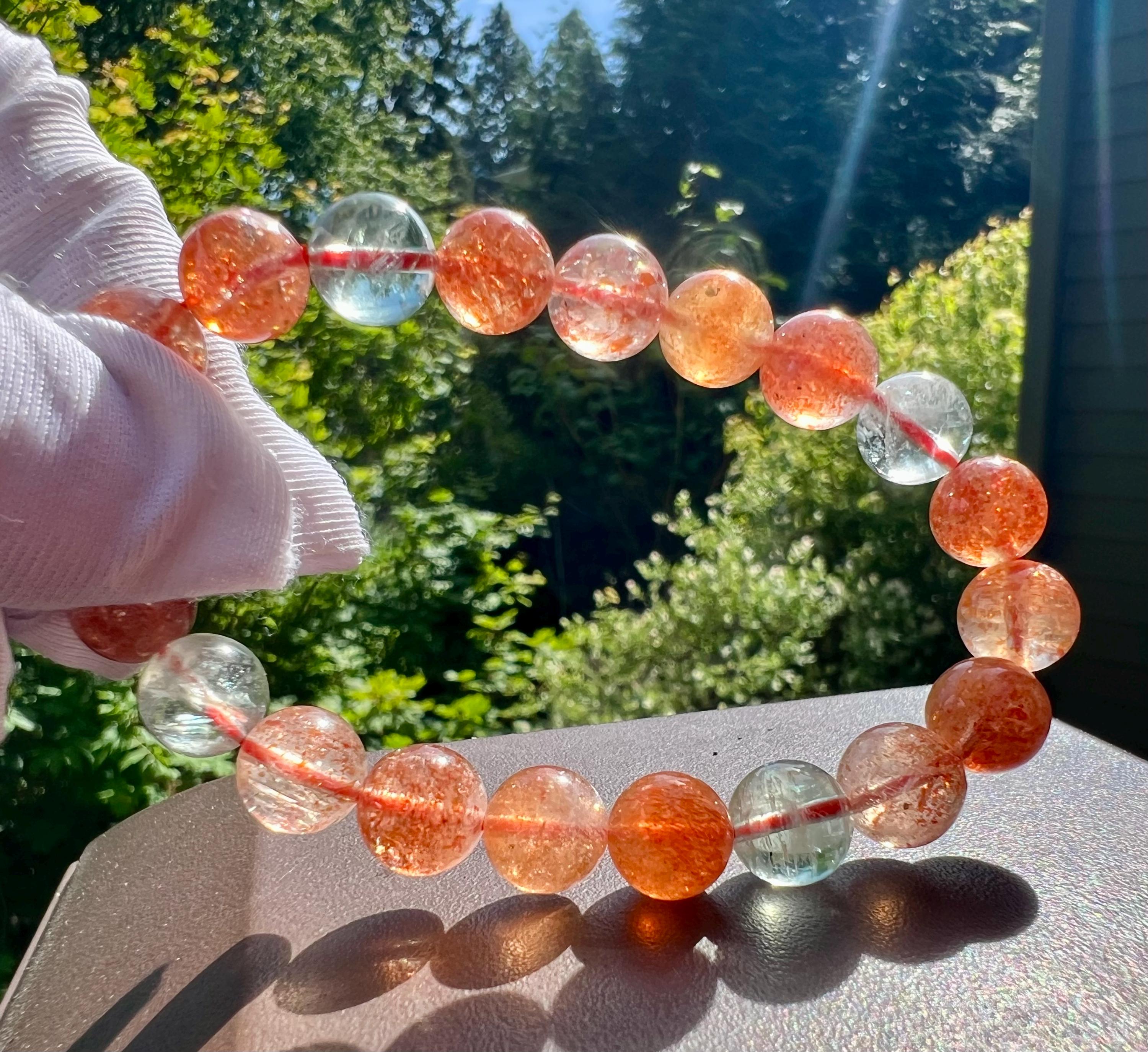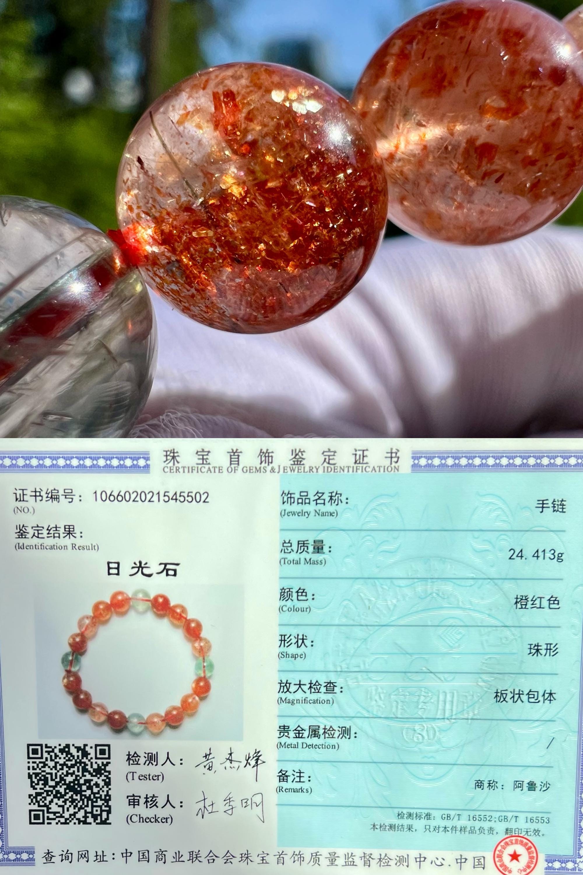 9.5mm Certified natural high quality Arusha bracelet, golden sunstone and light green Beryl/powerful crystal 天然阿鲁沙金太阳石金草莓绿柱石共生手串 #5502